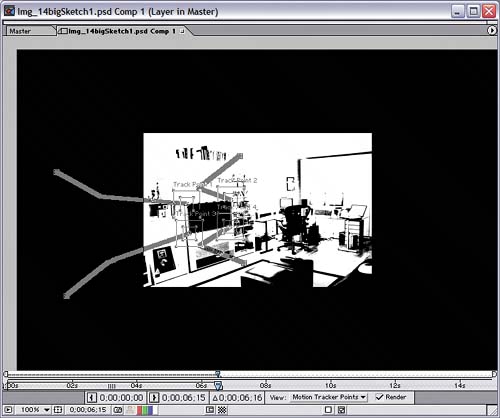 | The Img_14bigSketch images show a big-screen TV that doesn't display anything; in fact, the TV screen is transparent in the source file. Your next task is to fill the TV screen with the FillMovie.mov file, which shows a sequence of still images that should look very familiar since several of them are in the background layer you created. This task would be mighty simple if the still image that contains the TV stayed true to itself and remained still! Since you've animated it, though, you need to track the motion of the TV screen with a Perspective Corner Pin tracker and apply that motion data to the movie file. Even though you've animated the Img_14bigSketch1 layer, After Effects won't let you track the layer's motion, since it's a still image. To get around this, you'll pre-compose a duplicate copy of the layer and track the motion in the new composition. Note The motion-tracking features are available only in the Professional version of After Effects. If you have the Standard version, you can install a trial version of After Effects Professional from this book's DVD. Here are the steps: 1. | Go to time 0;00 in the Master Timeline, and place FillMovie.mov above the other layers in the Timeline.