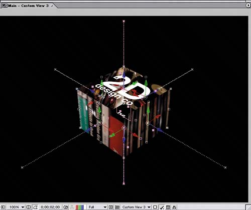 a2d_designlogo, layer 2: 50, -490, 0 Clip 01 Comp 1: 50, 50, -580 Clip 02 Comp 1: -530, 50, 0 Clip 03 Comp 1: 50, 50, 580 Clip 04 Comp 1: 630, 50, 0 a2d_designlogo, layer 7: 50, 590, 0 Position values at time 0;00 The cube viewed in Custom View 3 before it implodes The cube with motion paths that illustrate the path each side travels on  | The cube's sides currently come in at full Opacity. To give them more nuances, you can fade them into the scene by animating their Opacity: 1. | Select all the layers except Null 1 in the Main Timeline, and press T on your keyboard to display their Opacity properties.