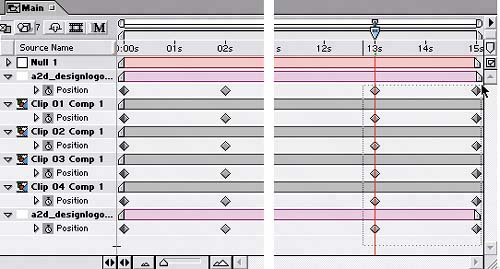 | 6. | Use the Selection tool to drag a marquee around (appears as a dotted line as you drag) and select all the Position keyframes that appear starting at time 13;00 and later in the Timeline. To create a selection marquee, make sure you click somewhere other than on a keyframe or a duration bar.