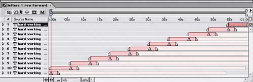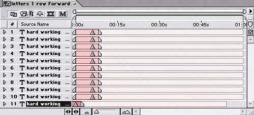Staggering the layers in time so each starts at the layer marker of the layer below it  | If you preview the comp, the line of text travels across the screen from right to left and looks like it never ends. Changing directions To make the background more dynamic, it also needs lines of text going in the opposite direction of the text you just created. Luckily for you, this part is far simpler than before. You'll duplicate the "letters 1 row Forward" composition and reverse its keyframes in time: 1. | Duplicate the "letters 1 row Forward" composition in the Project window. Name the duplicate "letters 1 row Reverse".