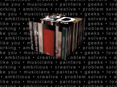 | Now, compare the illustration of the frame at time 2;09 to the same illustration of this frame in the previous section. Even though you and I know that the background of words has no depth, the user will focus on the cube's shape, and the background will seem like a landscape receding into the distance. It's a nice effect without having to skew the lines of text into perspective. The Main composition at time 2;09  |