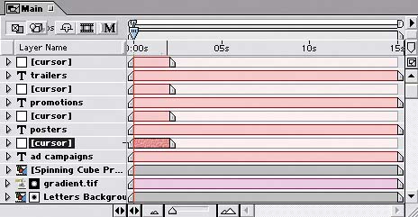 | 13. | Place one cursor layer above each of the text layers (trailers, promotions, posters, ad campaigns) in the Timeline's layer stack.
