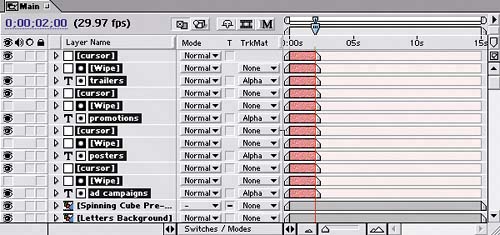 Your Timeline should have layers in the following order: cursor, Wipe, trailers, cursor, Wipe, promotions, cursor, Wipe, posters, cursor, Wipe, ad campaigns, Spinning Cube Pre-comp, Letters Background.
