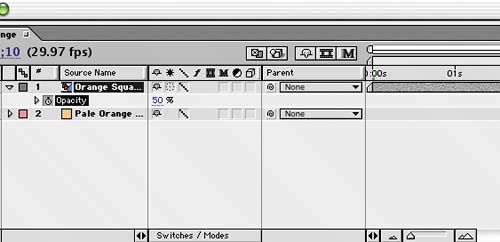| 5. | Add a 100% Opacity keyframe (Windows: Alt+Shift+T; Mac OS: Option+Shift+T) to the Squares BG layer.