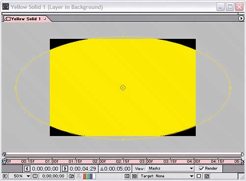 | 2. | Use the Elliptical Mask, Rectangular Mask, or Pen tool to draw a large shape out of the solid. We used the Elliptical Mask tool and created a mask that surrounds most of the solid but doesn't cover its corners. (Again, it's not important that your mask be exactly like ours. However, if you prefer it to be, draw an oval with the Elliptical Mask tool, and then click the Shape value next to the Mask Shape property in the Timeline and enter -169.72977 for Left, -12.252265 for Top, 889.72913 for Right, and 495.8559 for Bottom. Surely that's not as fun as creating your own maskbut each to their own, eh?)