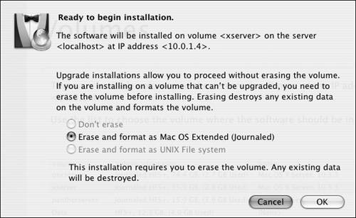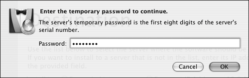 | Tips Keep the server disks in a safe place. If you're managing a server remotely, it may be a good idea to keep the Install CD 1 in the CD/DVD tray and/or affix the server serial number stickers to the CD itself. Apple has provided almost every GUI tool with a command-line equivalent. If you wish to install via the command line, you can do so. Booting from the Install CD 1 runs the ssh daemon, so you can discover and connect to the Macintosh with a command-line interface. To do so, you should install the Server Admin tools on the Macintosh from which you wish to issue commands. Finding Your Server The IP address in the Destination window can be the 169.254.x.x Rendezvous style with a host name of localhost; or, if a DHCP server is present, it may have an IP address and subsequent host name designated by the DHCP and DNS servers on your network. If you're in New York and you're setting up a server in Los Angeles, you can choose the Server at IP Address option in the Destination window and type in the real-world IP address of the machine booted off the CD in Los Angeles. |