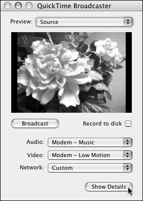 Figure 2.121. The Show Details button expands the QuickTime Broadcaster window.  Click the Show Details button to view all the options.