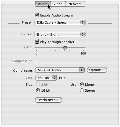 Figure 2.122. In the Audio settings dialog, select the Enable Audio Stream check box.  You must select the compression preset and the audio source from the pop-up menus. Several built-in compression presets are good starting points; you can tweak them further with the settings that follow.