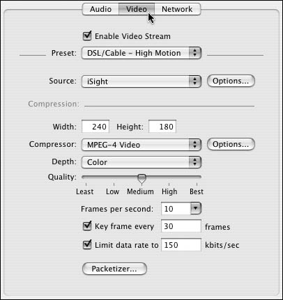 Figure 2.123. In the Video settings dialog, select the Enable Video Stream check box.  You must select the compression preset and the video source from the pop-up menus. Again, several built-in compression presets are good starting points; you can tweak them further with the settings that follow.