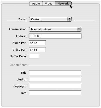 Figure 2.124. In the Network settings dialog, select Manual Unicast from the Transmission pop-up menu and enter the client's IP address.  Select Manual Unicast from the Transmission pop-up menu, and enter the IP address of the client you're sending the broadcast to.