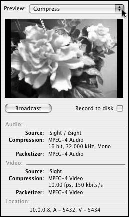 | 7. | Select Compress from the Preview pop-up menu in the main QuickTime Broadcaster window to preview the video feed with your current settings (Figure 2.125).