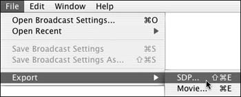 Figure 2.126. Select File > Export > SDP.  A Save dialog appears, in which you can choose the destination and name for the session description file. The client uses this file as instructions for connecting to your broadcast.