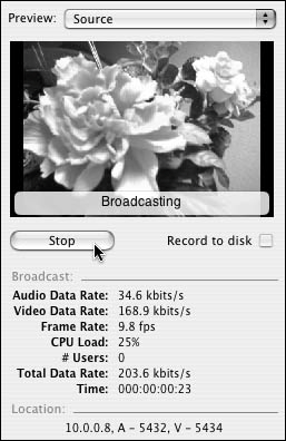 | Tips As your stream is being broadcast, you can also monitor the video feed and connection settings from QuickTime Broadcaster. Click the Stop button to stop the live media stream (Figure 2.130). Figure 2.130. Click the Stop button below the broadcast Preview window to stop the stream.