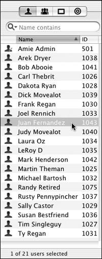 If you're working on the local directory, choose Local. If you're working on an Open Directory master, choose /LDAPv3/127.0.0.1. If you're connected to another database, choose Other, and select your database from there. Figure 4.3. Select the appropriate directory database from the selection pop-up menu.  | 4. | Select the user or users you wish to configure from the user list (Figure 4.4).