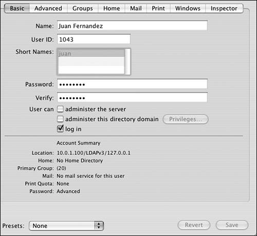 Adding short names The initial short name of a user in Mac OS X is the name of that user's home folder. Although you can add more short names, changing the original isn't a good idea unless you have a specific reason to do so. Apple recognizes this fact. Toward that end, the only user attribute you can't change in the Basic tab of Workgroup Manager after you've created a user account is the user's short name. To remedy this situation, Mac OS X server lets you add several additional short names. Once they're configured, the user can use any short name they desire for authentication. To add short names: 1. | In Workgroup Manager, navigate to configure the user's Basic account attributes (Figure 4.6).