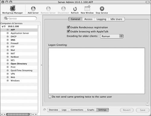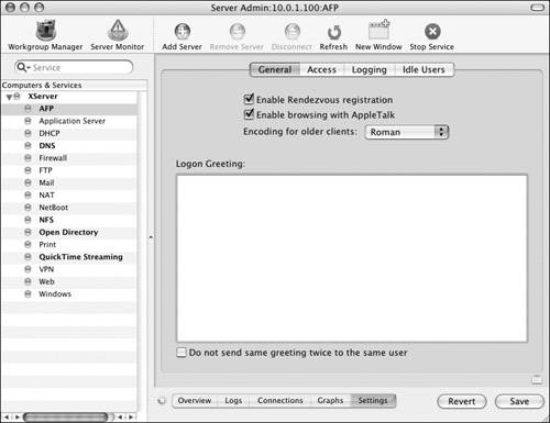 | Tip Managing idle users The AFP service requires a bit of overhead to maintain persistent server/client connections. The overhead per connection is quite low; however, when you have many connections simultaneously, this overhead can waste valuable server CPU and network resources. To remedy this situation, the server can automatically disconnect clients who are connected to your server but not actively using it. When this functionality is configured, idle disconnections on computers running software older than Mac OS X 10.3 should receive a message that that they have been disconnected. To disconnect idle clients: 1. | Within Server Admin, navigate to your server's AFP service settings (Figure 5.31).