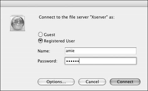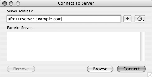 You can also connect directly in the Finder by selecting Go > Connect to Server from the menu bar and entering an AFP address or by pressing Command-K from the keyboard (Figure 5.23).