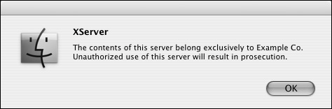 Login greetings A login greeting is a string of text that appears as soon as a user attempts to log in from a client computer. Login greetings can be used for general service information or usage disclaimers for server access. More and more often, users must agree to the legal ramifications of using an employer's computer services. Using a login greeting is perfect for this task, because the user must click the OK button to dismiss the login greeting dialog and connect to your server. Such login greetings usually begin with, "By clicking the OK button you agree to...." To add a login greeting: 1. | Within Server Admin, navigate to your server's AFP service settings (Figure 5.27).