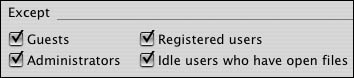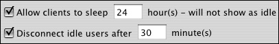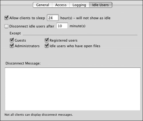 | Tips The "Allow clients to sleep" setting on the Idle Users tab lets the client computers sleep without counting as an idle connection. Computers sleeping and connected don't produce the extra overhead that running computers with idle connections do. You should always select the idle disconnect exception for idle users who have open files. Deleting all the text in the Disconnect Message field disables the message when an idle connection is disconnected. | Computers running Mac OS X 10.3 or later handle AFP idle disconnects in a very different manner. Your server still automatically disconnects, but the user shouldn't notice. The share point remains mounted to the client computer, yet the connection is idle. Essentially, the system hides the idle connection from the user. When the user tries to access the share again, the system automatically reconnects to your server. Furthermore, Mac OS X 10.3 or later attempts to reconnect to AFP connections that have been dropped due to network disconnects or sleep/wake cycles. |