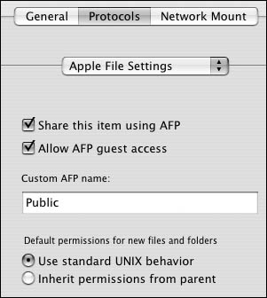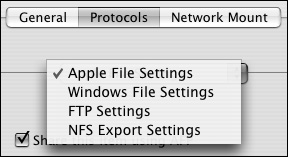 | 5. | Directly below the Protocols tab is the Protocols pop-up menu. From this menu, select Apple File Settings (Figure 5.39).