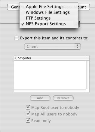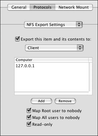 | 5. | Directly below the Protocols tab is the Protocols pop-up menu. From this menu, select NFS Export Settings (Figure 5.101).