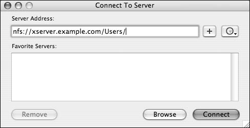 | Tips Aside from what you've configured here, all access to this share point is granted based on file-system permissions. See "Configuring File and Folder Permissions" for more information. In order for guests to access a share point, its permissions must be set to allow everyone read access. You can have only one World-viewable NFS export per server. Setting up your own World-viewable NFS export will interfere with the NetBoot service, because it uses a World-viewable NFS export to share boot images. To delete an NFS export, deselect the "Export this item and this contents to" check box, and then click the Save button. | You can connecting to an NFS export from a Mac OS X client as follows. In the Finder, click the Network icon to browse for your server. Mac OS X Client can browse for NFS exports via the Rendezvous protocol. You can also connect directly in the Finder by selecting Go > Connect to Server from the menu bar and entering an NFS export server and path address or by pressing Command-K from the keyboard (Figure 5.111).  Default settings dictate that the share point's icon mounts on the Finder's desktop . |