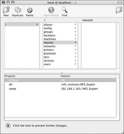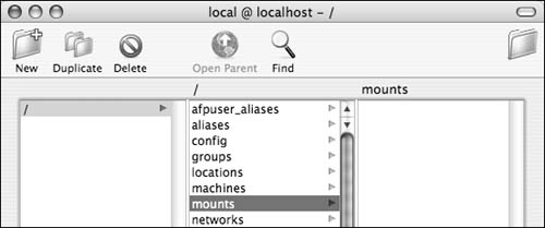 | 6. | In the NetInfo Manager directory browser, select the mounts directory (Figure 5.114).