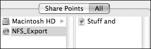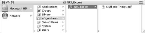 Resharing an NFS share point The lack of secure NFS authentication prevents many people from implementing NFS services to desktop clients. Thus, authenticated protocols such as AFP and SMB are used instead. However, depending on the organization, large investments may have been made in NFS-based file servers that don't support AFP or SMB. Mac OS X Server is unique in filling this gap by providing the NFS reshare service. Basically, your Mac OS X Server connects to another NFS export and then reshares that export via AFP or SMB. Clients connect securely via their native protocol to your Mac OS X Server, and it acts as a conduit to the other NFS server. This process lets you keep your current NFS-based server infrastructure and at the same time provide native and secure authentication to the desktop clients. The system administrator for the originating NFS export must allow your Mac OS X Server root access to the export. This is required because the AFP service runs as root on your server. The security risk created by allowing root access is overcome by configuring the NFS export to allow access only by your server. You can also set up a private network for this connection. To reshare an NFS share point: 1. | On your Mac OS X Server, use the Finder or the command mkdir to create a folder at the root of the system drive called nfs_reshares.