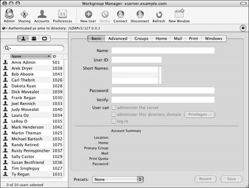 | 11. | Launch the Workgroup Manager tool located in /Applications/Server, and authenticate as the administrator (Figure 5.121).