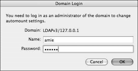 | Share points that are configured to automatically mount on your clients at startup are called network mounts. (In previous versions of Mac OS X Server, they were sometimes called automounts.) It's important to understand that network mounts are always available to any user on the client computer, whereas a share point located in the user's Startup Items is available only to that user and is mounted only when the user logs in. Essentially, network mounts are instructions stored in a directory database that tell client computers to mount certain share points at startup. Thus, the Workgroup Manager tool can configure network mounts only for servers that are part of a directory service system. The server hosting the actual share points can be either an Open Directory master or connected to another directory server. In addition, your client computers must be configured as clients of the directory service system. (For more information about Directory Services and Open Directory, see Chapter 3.) Network mounts are an important option because there are certain share points that client computers must have access to at all times. For instance, to provide network home directories for your users, the share point that hosts the home directories must be mounted on the client computer prior to user login. To create a home directory network mount: 1. | Launch the Workgroup Manager tool located in /Applications/Server, and authenticate to the server hosting the share points as the administrator (Figure 5.134).