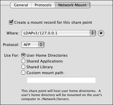 To configure a new share point that also has the network mount option, see the task "To configure new share points" earlier in this chapter. | 4. | Once you've selected the share point on which you wish to enable the network mount option, click the Network Mount tab to the right of the sharing browser (Figure 5.136).
