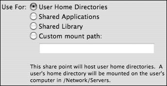 | Tip Creating additional network mounts You may find it useful to add other types of share points as network mounts. Examples include a shared Applications folder, a shared Library folder, or any other share point you want to automatically mount to a specific point on the local client. To create additional network mounts: 1. | Use the Workgroup Manager tool to create a network mount share point.