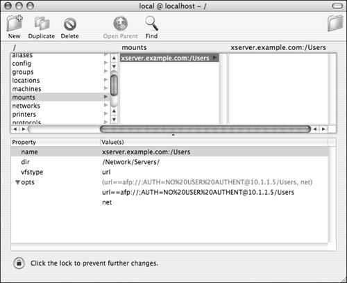 | Tip | Instructions for automatic network mounts can be stored in any directory database, including the client's local NetInfo database. From the client in NetInfo Manager, you can add new mount directory entries. For an idea of how to do this, refer to steps 59 of the task "To reshare an NFS share point," earlier in this chapter. You need to add only a few properties and values for each mount entry: A typical network mount entry has the following properties (Figure 5.143):  |