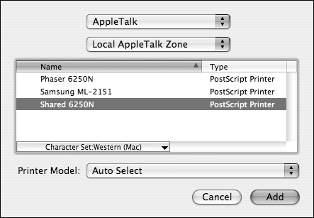 AppleTalk If your AppleTalk network is configured with multiple zones, select the appropriate zone from the pop-up menu. In either case, AppleTalk printers automatically populate in the list. Select the printer from the list, and click Add (Figure 7.27).