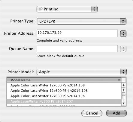 IP Printing/LPR From the Printer Type pop-up menu, choose LPD/LPR. Enter the server's address and, optionally, the queue name. If you want to specify a printer driver other than the Generic driver, you may do so by selecting it from the Printer Model pop-up menu. When you're done making changes, click Add (Figure 7.28).