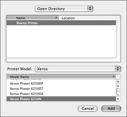 Open Directory You can use this option if your client is configured for Open Directory and you've added printer records to your master Open Directory server. See the task "To configure a printer in Open Directory," earlier in this chapter, for more information. Otherwise, select the printer from the list, and click Add (Figure 7.29).