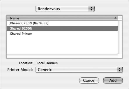 Rendezvous If your server and client are on the same subnet, you can use Rendezvous to discover printers. Printers or shared queues configured with Rendezvous automatically populate in the list. Select the printer from the list, and click Add (Figure 7.30).
