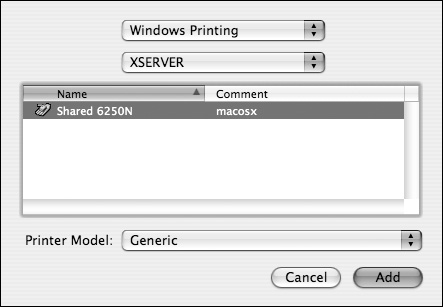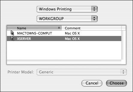 Windows Printing If your Windows network is configured with multiple workgroups, select the appropriate workgroup from the pop-up menu. Initially you'll be presented with computers running Windows (SMB) printer sharing. Select a computer from the list, and click the Choose button (Figure 7.31). You'll have to authenticate with a user account (Figure 7.32). Then, select the printer from the list, and click Add (Figure 7.33).