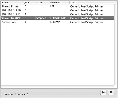The Queues frame appears. It shows all your active print queues and the number of jobs in each queue (Figure 7.41). Notice in the figure that the selected queue is stopped.