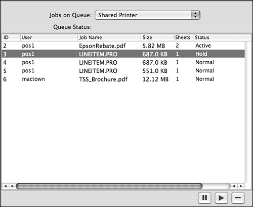 The Jobs frame appears. It shows all the active print jobs for a specific queue (Figure 7.42). Notice that the selected job is on hold.