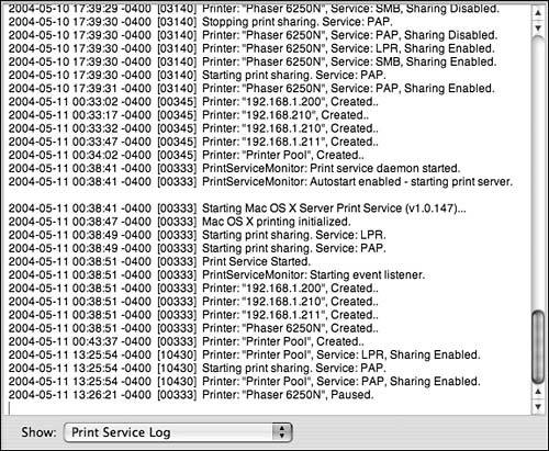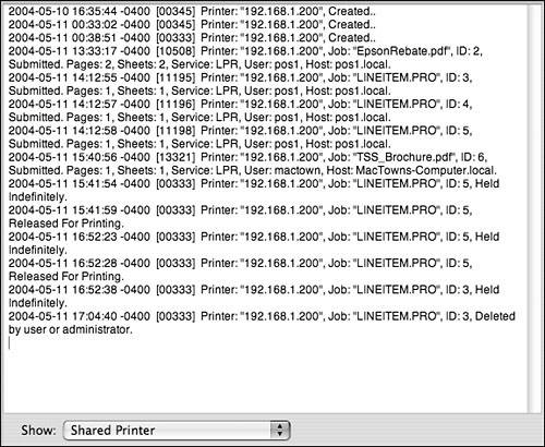 4. | Click the Show pop-up menu, and choose a printer queue to view its log (Figure 7.46).