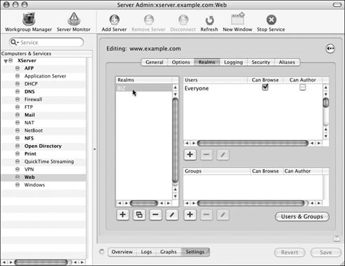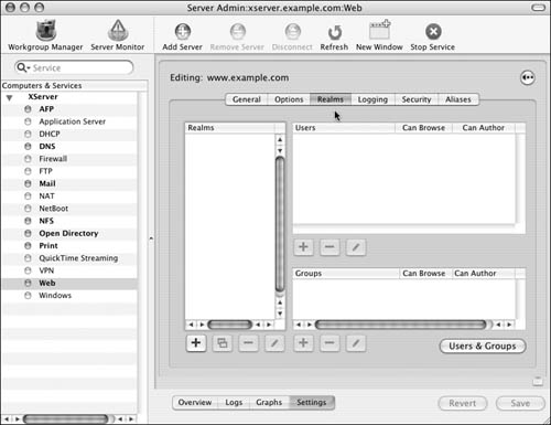 | The Apache Web server uses realms to control access to items in a Web site's folder. By default, everything in your Web site's folder can be read by everybody. However, once you specify a folder in your Web site's folder as a realm, you can enable restricted access to those Web site items based on user authentication. Configuring realms is also the first step required to enable secure Web Distributed Authoring and Versioning (WebDAV) support for your Web site. To add a realm to a site: 1. | Launch the Server Admin tool located in /Applications/Server, and authenticate as the administrator (Figure 9.38).