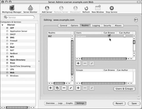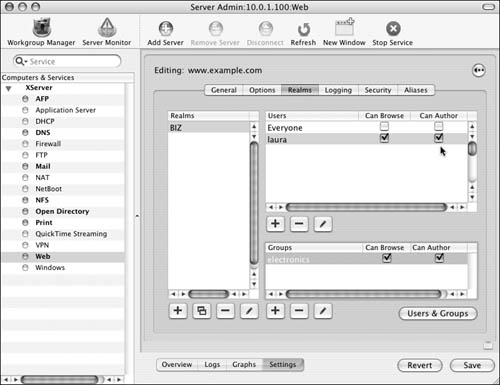 | Tips You can configure as many realms as you want for each Web site, including realms inside of other realms. However, you can only define a realm using the Web site's folder or anything in of that folder. It's important to remember that realm settings are configured separately for each Web site you have. You can always use the edit buttons below the realms list for further configuration. The Server Admin tool should automatically restart the Web service when you click the Save button . Adding users and groups to realms One of the many enhancements Apple made to the Apache Web server includes directory services integration. This means the Apache Web server grants authenticated Web site access via any user and/or group accounts known to directory services. For this reason, you must properly configure Directory Access on the server hosting your Web sites. (See Chapter 3, "Open Directory," for more information about directory services.) To add users and groups to a realm: 1. | Launch the Server Admin tool located in /Applications/Server, and authenticate as the administrator (Figure 9.46).