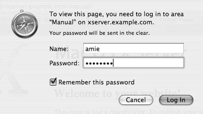 | Tips It's important to remember that realm settings are configured separately for each realm of each Web site you have. Make sure you thoroughly test authenticated access to your realms by accessing them from any Web browser. Mac OS X Server doesn't currently support very secure authentication for Web site access. If security is a concern, you should avoid using authenticated Web site access. | Once you've configured authenticated realm access, navigate to one of the files in the realm as you would any other file in your Web site. An authentication dialog appears, in which you can enter your user name and password (Figure 9.55). Notice that you can save your password to a keychain. Once authenticated, the Web site files should appear as normal.  |