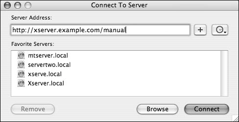 | Tips It's important to remember that realm settings are configured separately for each realm of each Web site you have. Make sure you thoroughly test authenticated access to your realms by accessing them from any Web browser. Mac OS X Server doesn't currently support very secure authentication for WebDAV access. If security is a concern, you should avoid using WebDAV access. | Connecting to a WebDAV server from a Mac OS X client involves the following steps: 1. | In the Finder, select Go > Connect to Server, and enter a fully qualified HTTP address (Figure 9.63).