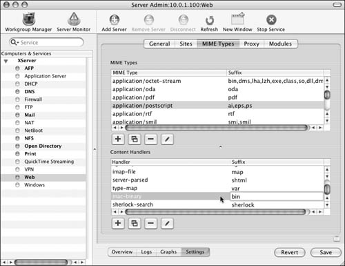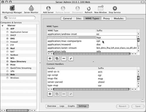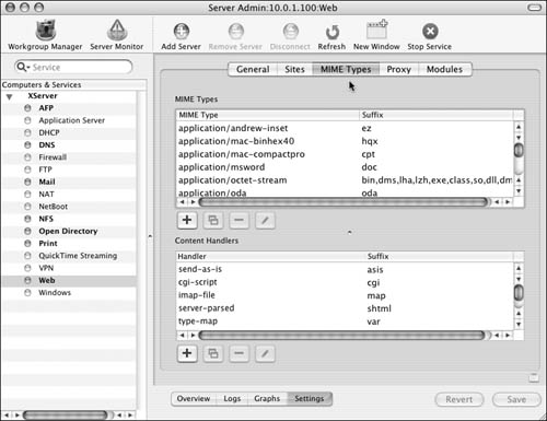 The MIME Types pane displays your Web server's lists of MIME types and content handlers (Figure 9.67).