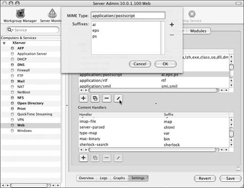 | Multipurpose Internet Mail Extension (MIME) is a standard protocol for defining how a user's Web browser handles files shared from a Web server. Typically, every file on your Web server has a file-type suffix appended to the end of the filename. MIME types define a specific action for a user's Web browser to take when it encounters a certain file-type suffix. Some examples of file-type suffixes configured with MIME types include .htm or .html for hypertext, .jpg or .jpeg for a picture file, and .qt or .mov for a QuickTime video file. Mac OS X Server's Web server comes with a preconfigured list of standard MIME types. However, you may need to edit or add to your server's MIME types list. To edit MIME types: 1. | Launch the Server Admin tool located in /Applications/Server, and authenticate as the administrator (Figure 9.65).