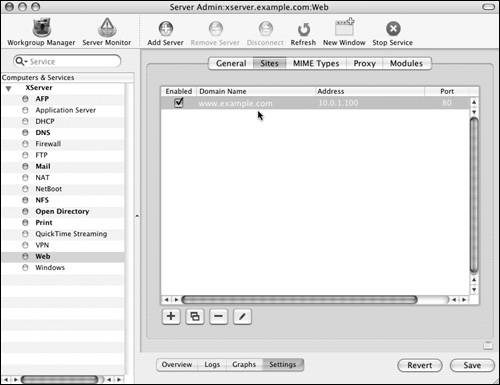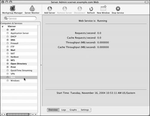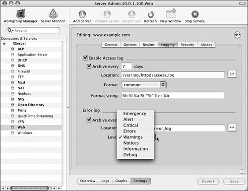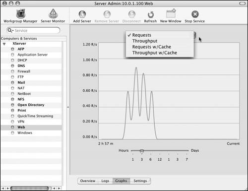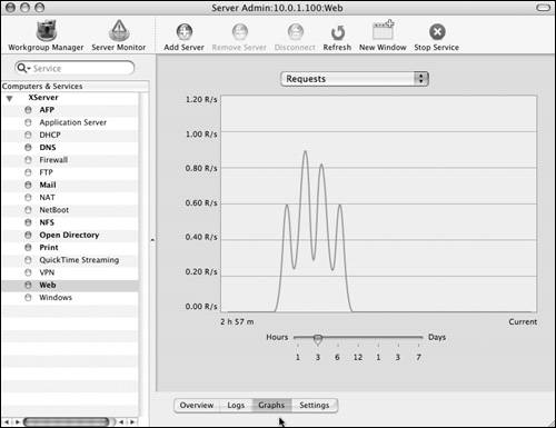 Mac OS X Server provides a variety of statistics for monitoring the Apache Web service. Using the Server Admin tool, you can monitor each Web site individually or the Web server as a whole. The information provided by the monitoring tools is invaluable for troubleshooting connection problems and determining if resources are being properly used.
