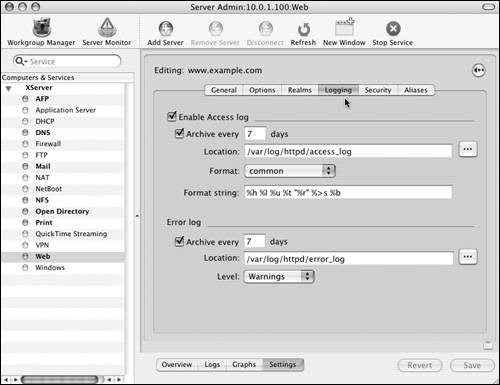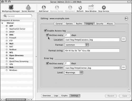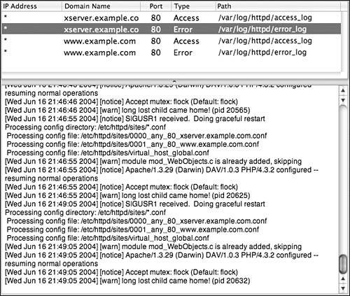 Although performance graphs in the Server Admin tool are nice to look at, the real business of Web site monitoring is in the log files. The Apache Web server is renowned for the extensive detailed information available in its log files. You can even modify the log-file formatting to meet your specific needs.