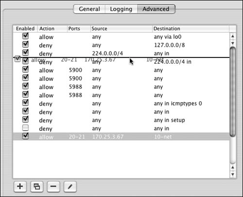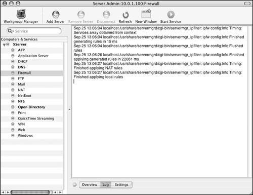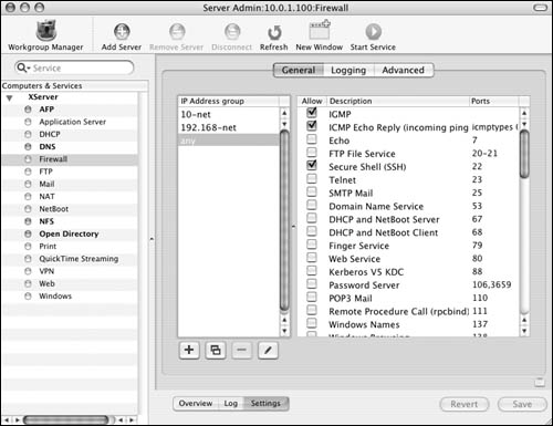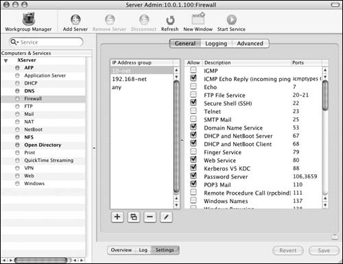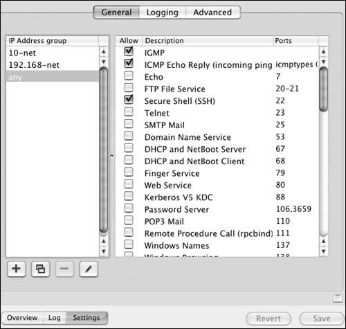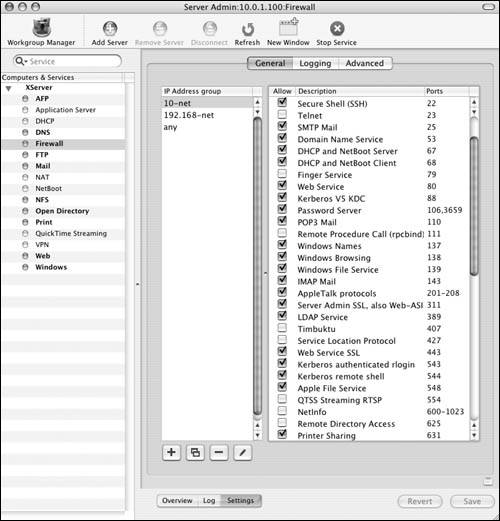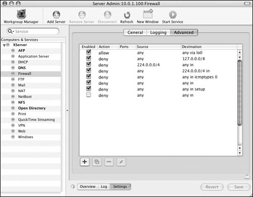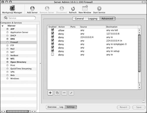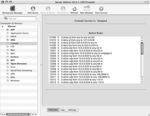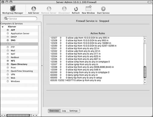 The Firewall service On Mac OS X Server, Apple has built in an interface for the firewall. Before you set a firewall in place, let's examine the Firewall window. The Overview tab shows the current firewall rules (Figure 10.6). They're listed in order of importance by the numeric value of the rule. For example, rule 65535 always allows all connections from any IP address to any IP address on your server. Rules that may restrict access are given a lower number and thus a higher priority.  The Log tab shows the Firewall log file (Figure 10.7). You can specify what gets logged in the settings window, as you'll see in a moment.  The Settings tab displays three additional tabs (Figure 10.8): You'll do most of your firewall work in the General tab . It displays two panes: "IP Address group" and a list of common ports. The "IP Address group" pane lets you create separate sets of rules, based on the IP address(es) of your server. The common ports window shows (what Apple considers) the ports most commonly associated with Mac OS X Server and its subsequent services. There are columns for activating the firewall on that port, the port number, and a description of the service that runs over that port(s).